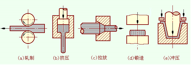 塑性加工的種類很多,根據加工時工件的受力和變形方式,基本的塑性加工有:鍛造、軋制、擠壓、拉拔、拉伸、彎曲、剪切等幾類。